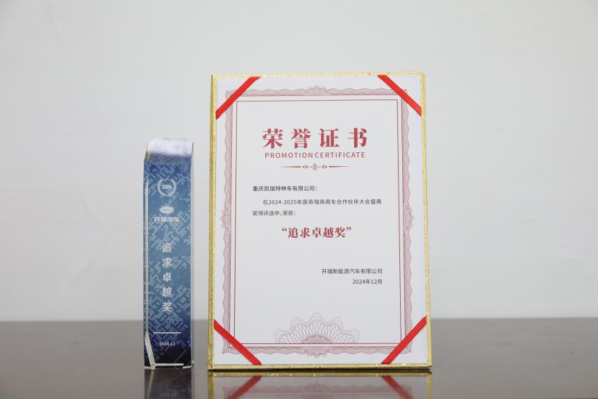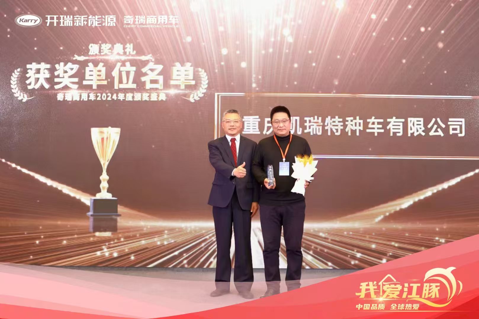 2024年12月31日,重庆凯瑞特种车有限公司参加了2024-2025年奇瑞商用车合作伙伴大会。会上,重庆凯瑞特种车旗下的QYZ5031XLCQRBEV型新能源VAN系冷藏车亮相大会现场,此款车型凭借卓越的市场表现和技术创新,荣获大会颁发的“追求卓越奖”。