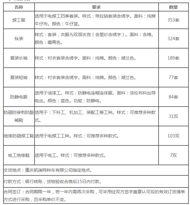 重庆凯瑞特种车有限公司(以下简称“公司”)拟对2019年劳保服和劳保鞋采购项目进行询价,欢迎有资格的供应商前来参加;供应商要认真审阅询价采购文件中相关须知与规定,制作的报价文件必须符合询价采购文件的有关要求。